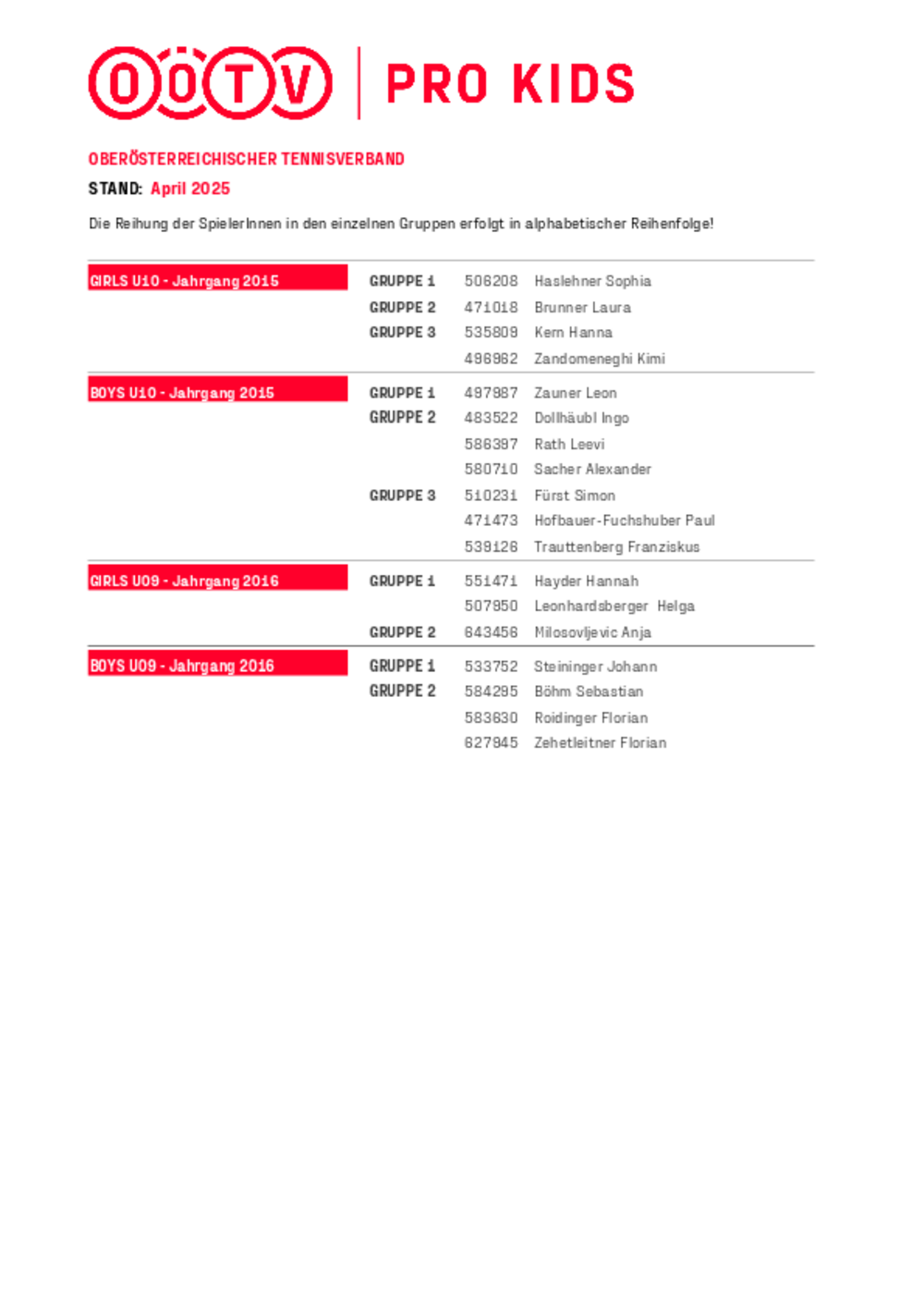 Spieler:innen der OÖTV-ProKids Gruppe 1 haben nationales Spielniveau, Spieler:innen der Gruppe 2 & 3 haben regionales Spielniveau.